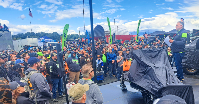 A big crowd gathered after a severe thunderstorm had passed to hear Arctic Cat CEO & President Brad Darling share a message before the sled and ATV unveiling.