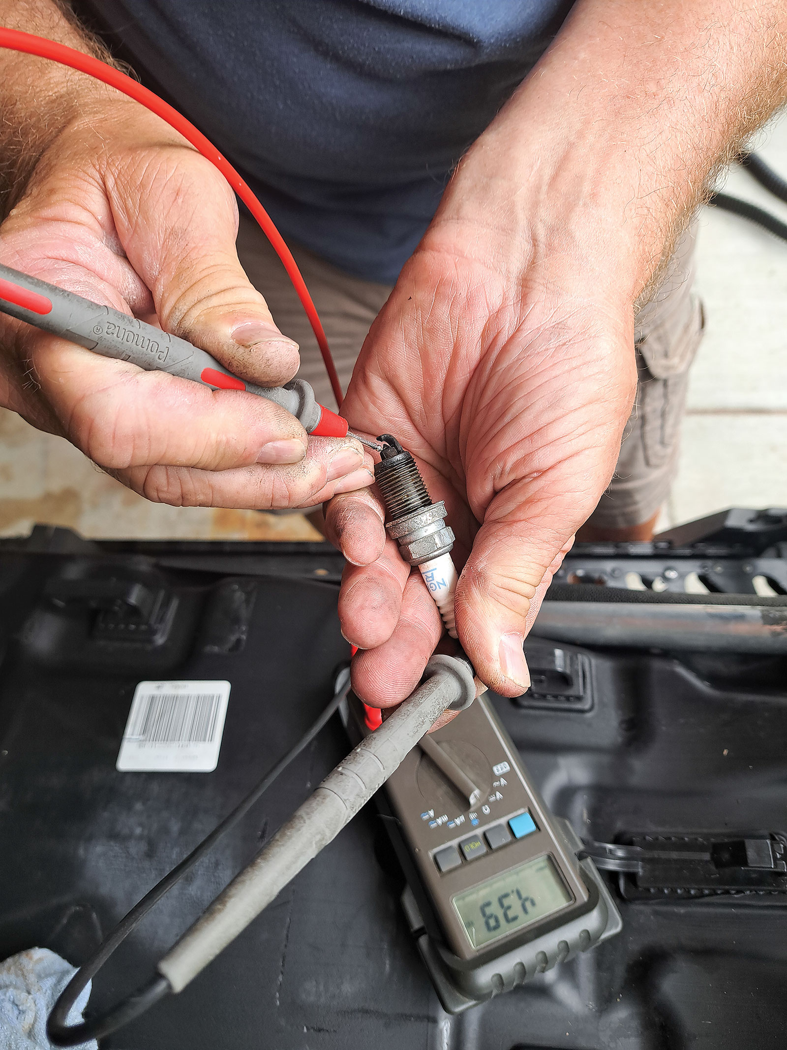 If there is no spark, however, test the actual spark plug. Remove the spark plug from the plug wire and set it on a towel or on a non-metal work bench for a test using your trusty multimeter.
